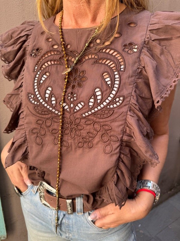 Blusa de fibrana 100% algodón sin mangas, totalmente bordada al frente, con volados en el frente hacia los hombros.