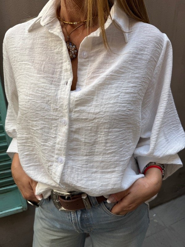 Manga caída 3/4 con terminación en puño ancho tipo globo.