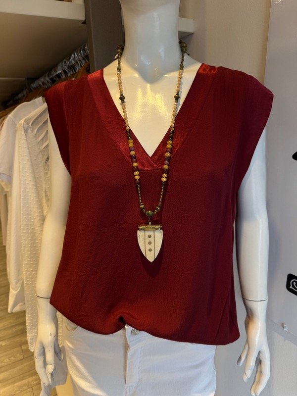 Cuello en V bajo con detalle de tablón satén y en hombros. Manga al hombro.