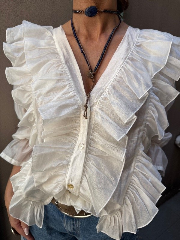 Corte a la cintura, cuello en V y volados en el frente y espalda.