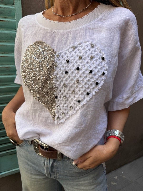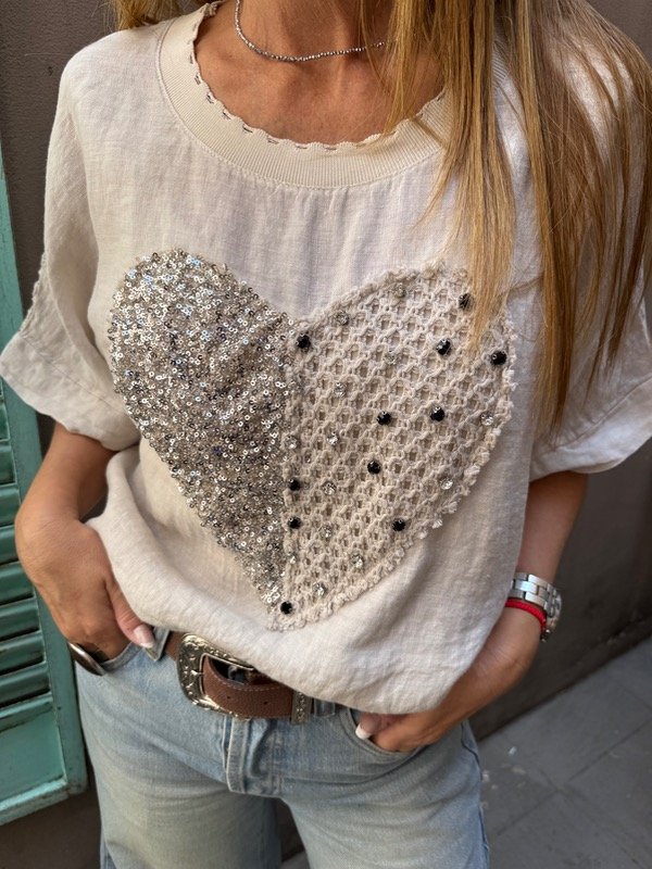 Estampado de corazón con crochet y strass bordados y apliques de lentejuelas.